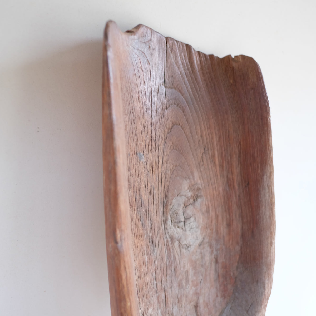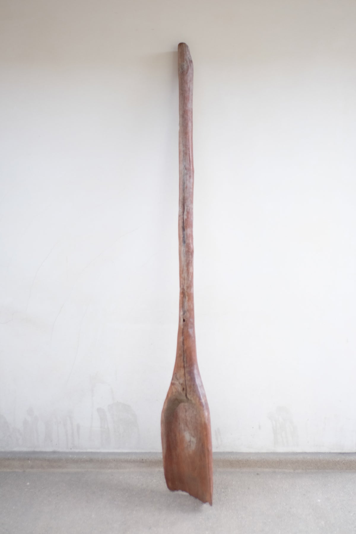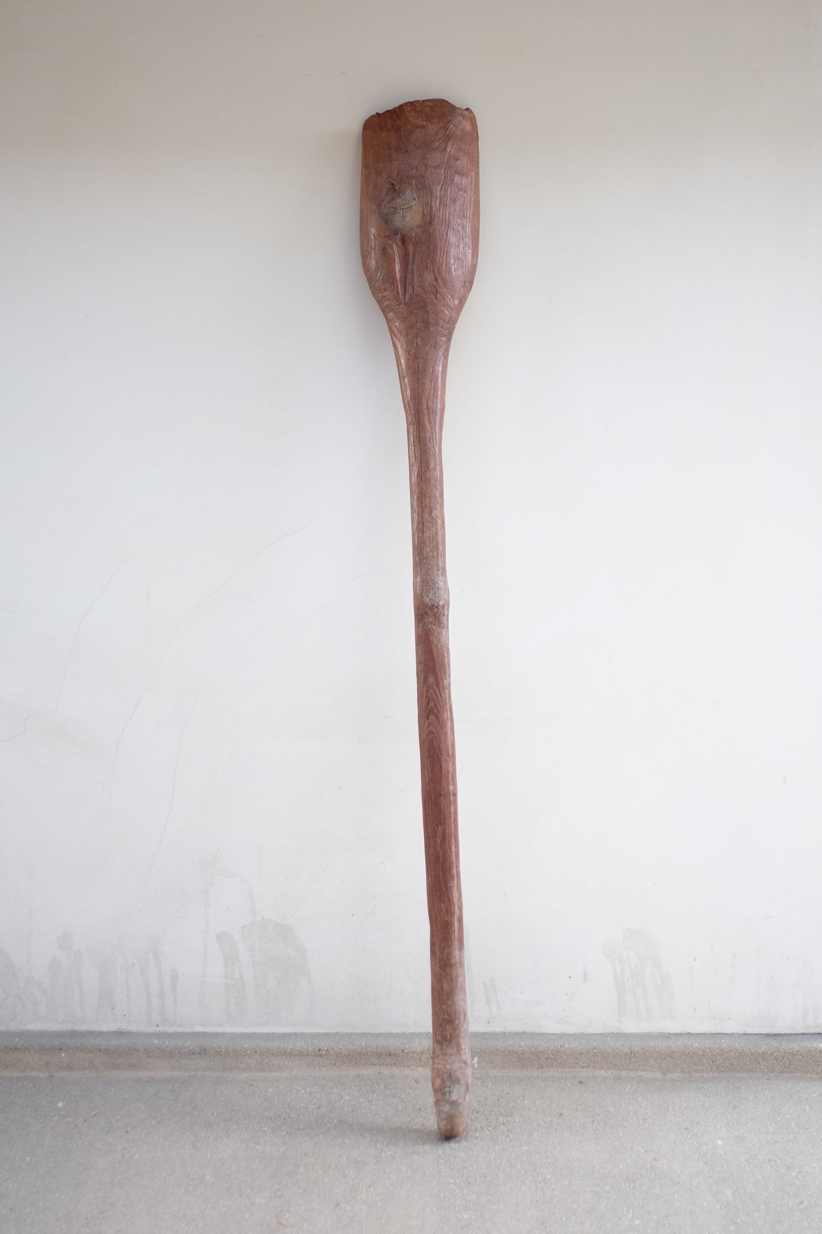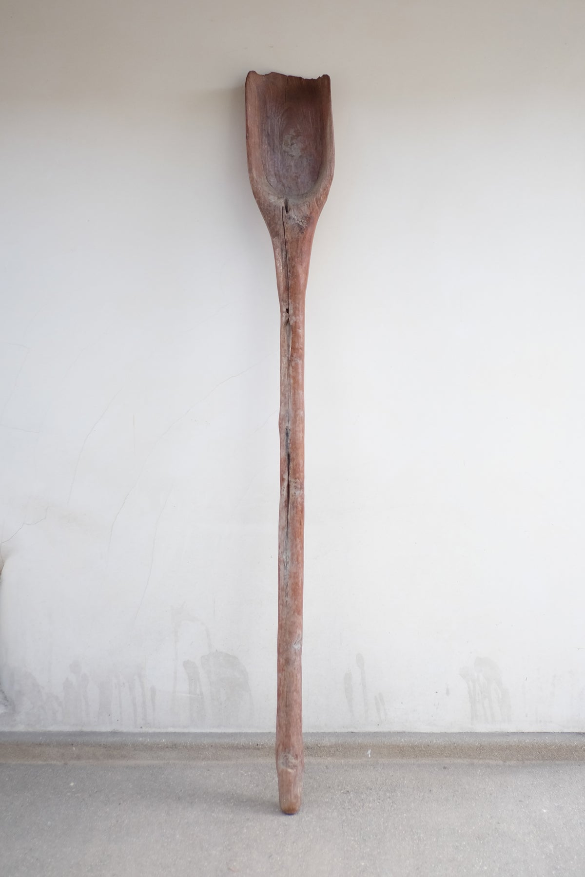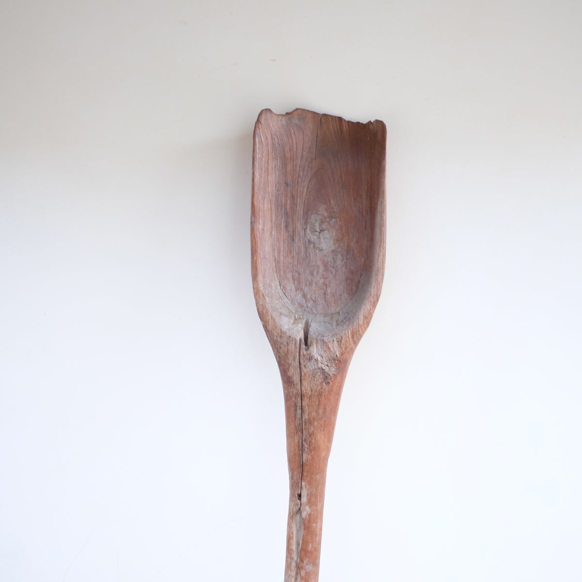 穀物類の移し替え用の農具として作られた、大きなスコップ状の木製ライスパドル。50年から100年ほど前に、タイで実際に使われていたものです。無垢の貴重な木材が使用され、経年変化が味わい深い一品。